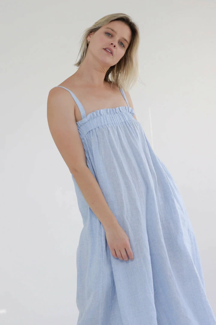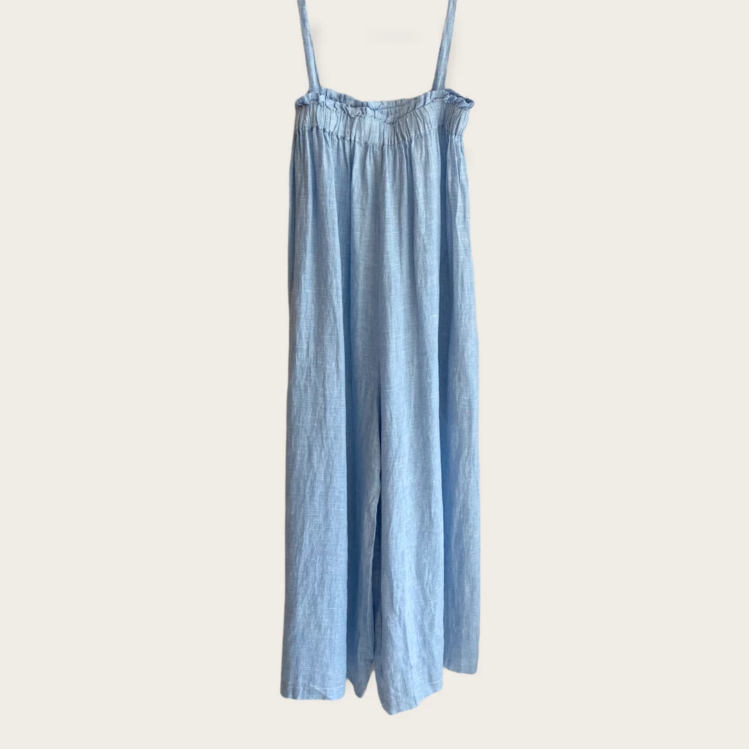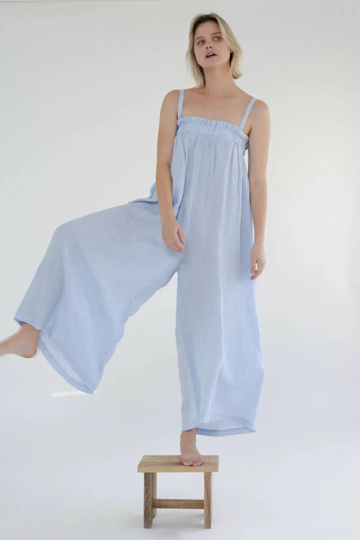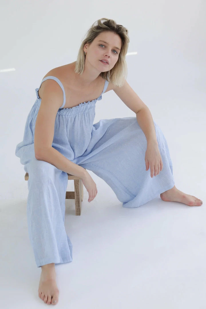Gingham linen wide-leg jumpsuit is an adjustable shoulder strap.