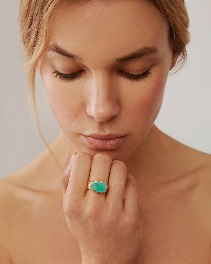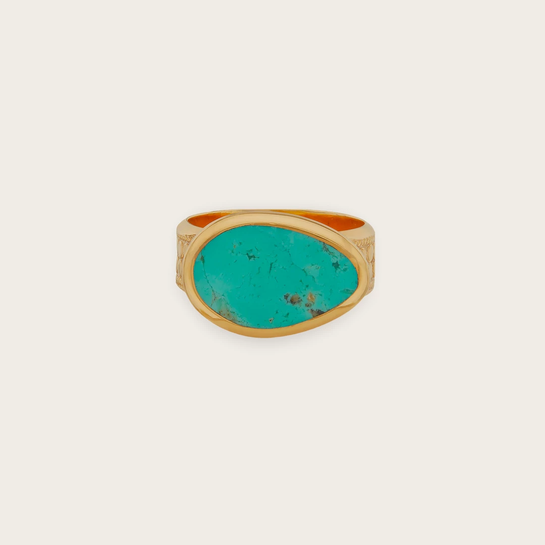 Infuse your style with the ultimate color crush: Turquoise. It pairs perfectly with a smooth gold setting and textured dot work around the band.