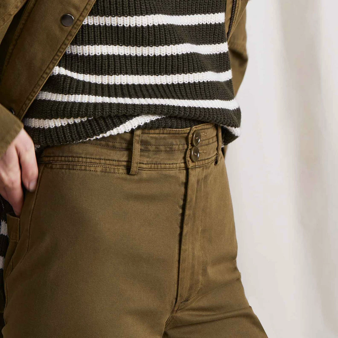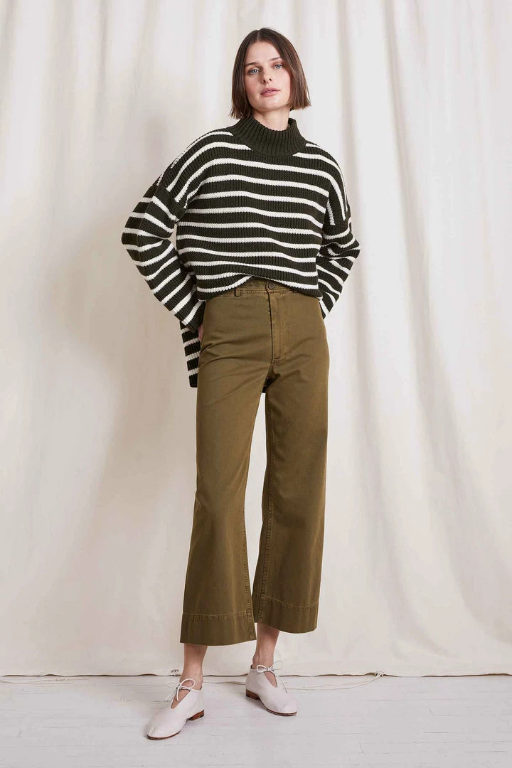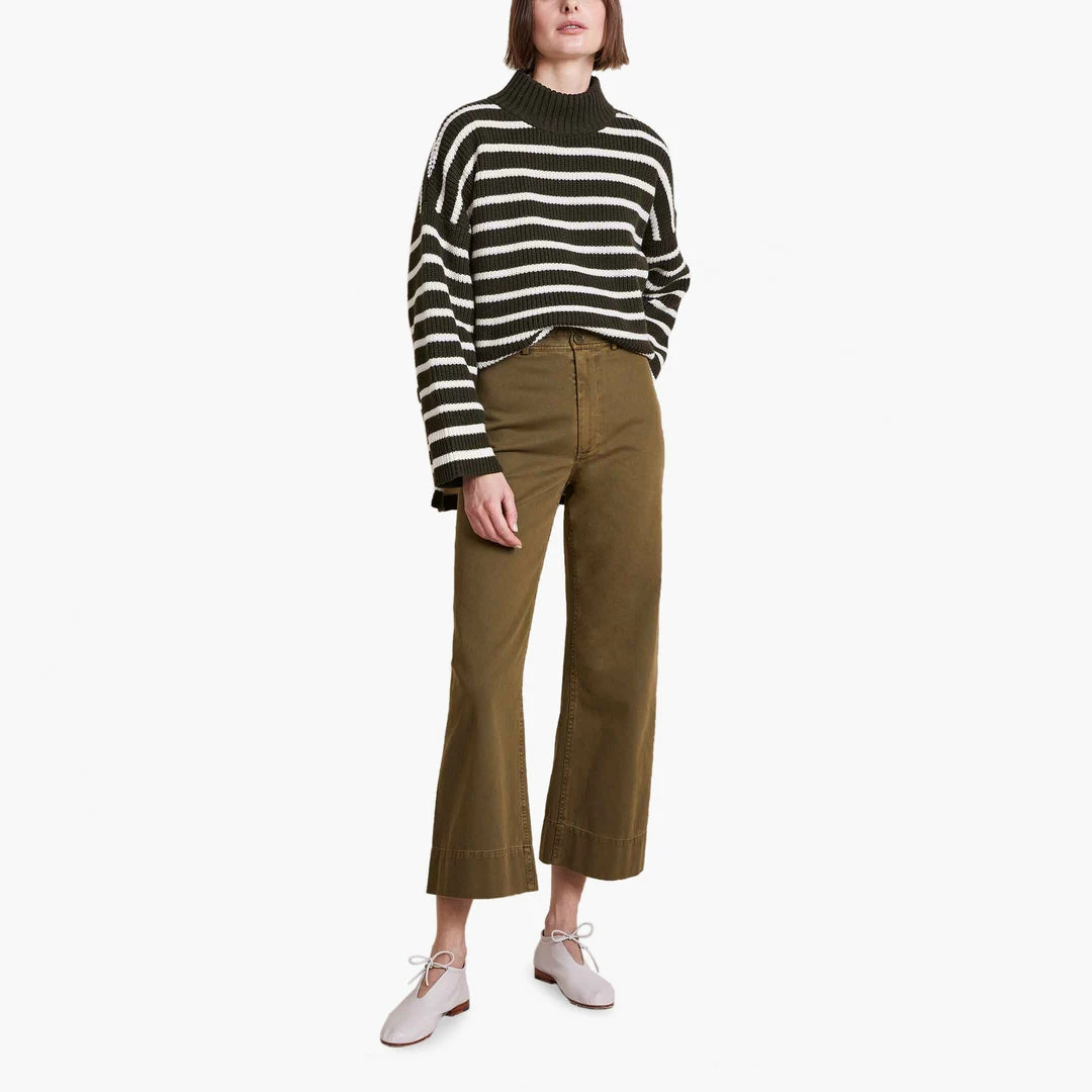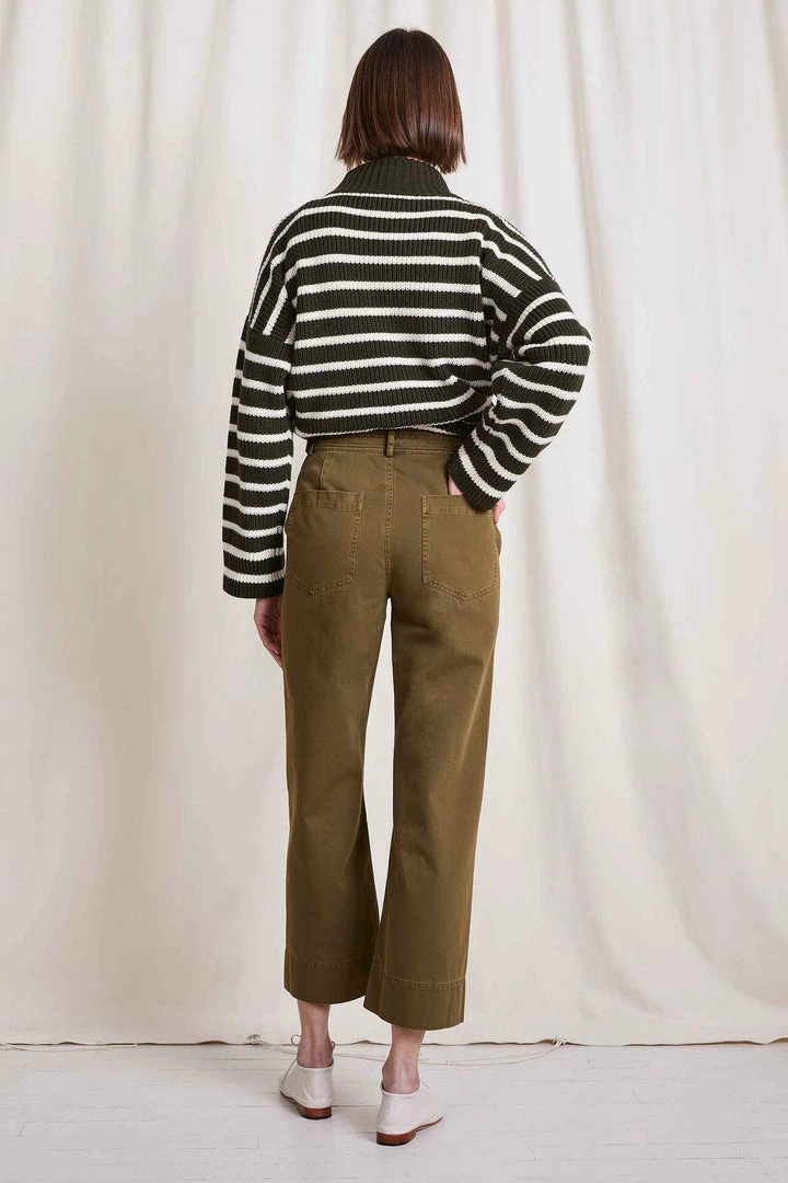 Our favorite, bestselling pant. A flattering, high-rise fit, designed for repeat wear in any season. Cut from a textured cotton, with a menswear-inspired straight waistband. Classic back pockets and nearly hidden front pockets add functionality. Slight crop at the ankle, with a zipper closure and Apiece Apart’s signature double buttons. Â