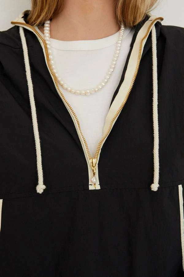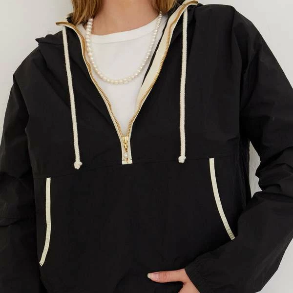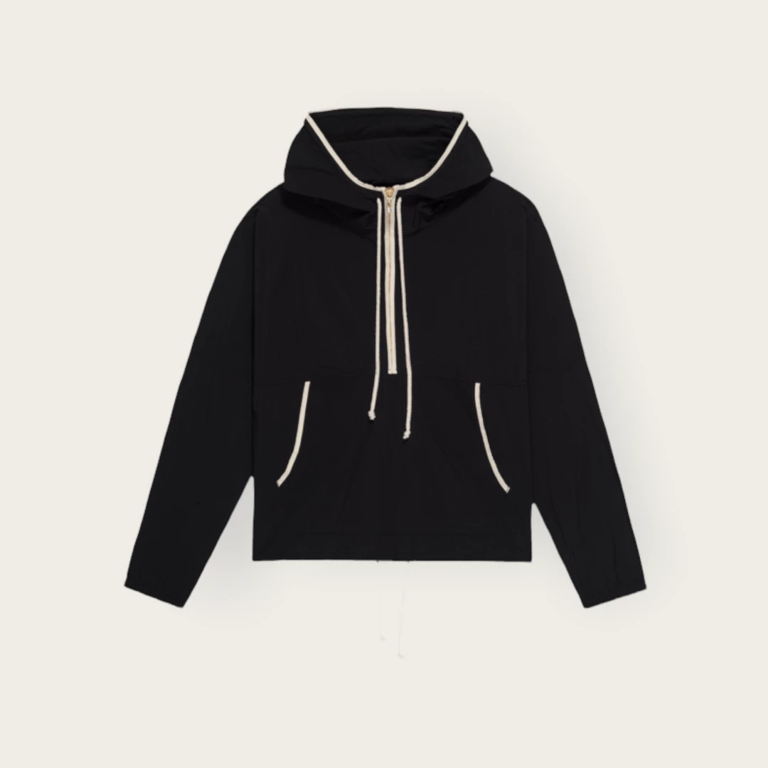 This pullover by Donni is a precious staple to add to your wardrobe. This piece reminds us we can both be comfortable and chic. Wear this to warm up before Pilates or while running everyday errands. It can be paired perfectly with the Cargo Short to complete the set. The Jet Black Pullover has cream accents and a pearl zip up detail.