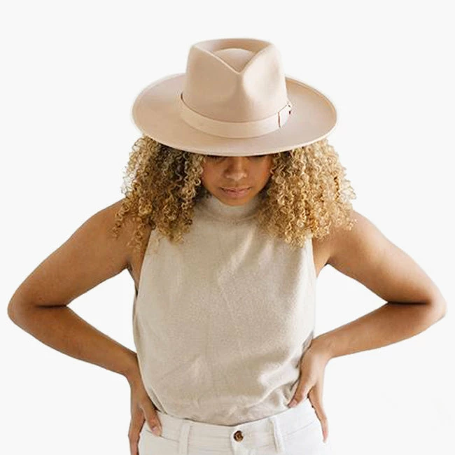 The Monroe is a teardrop crown with stiff, upturned brim adorned with a tonal grosgrain band on the crown and brim.
