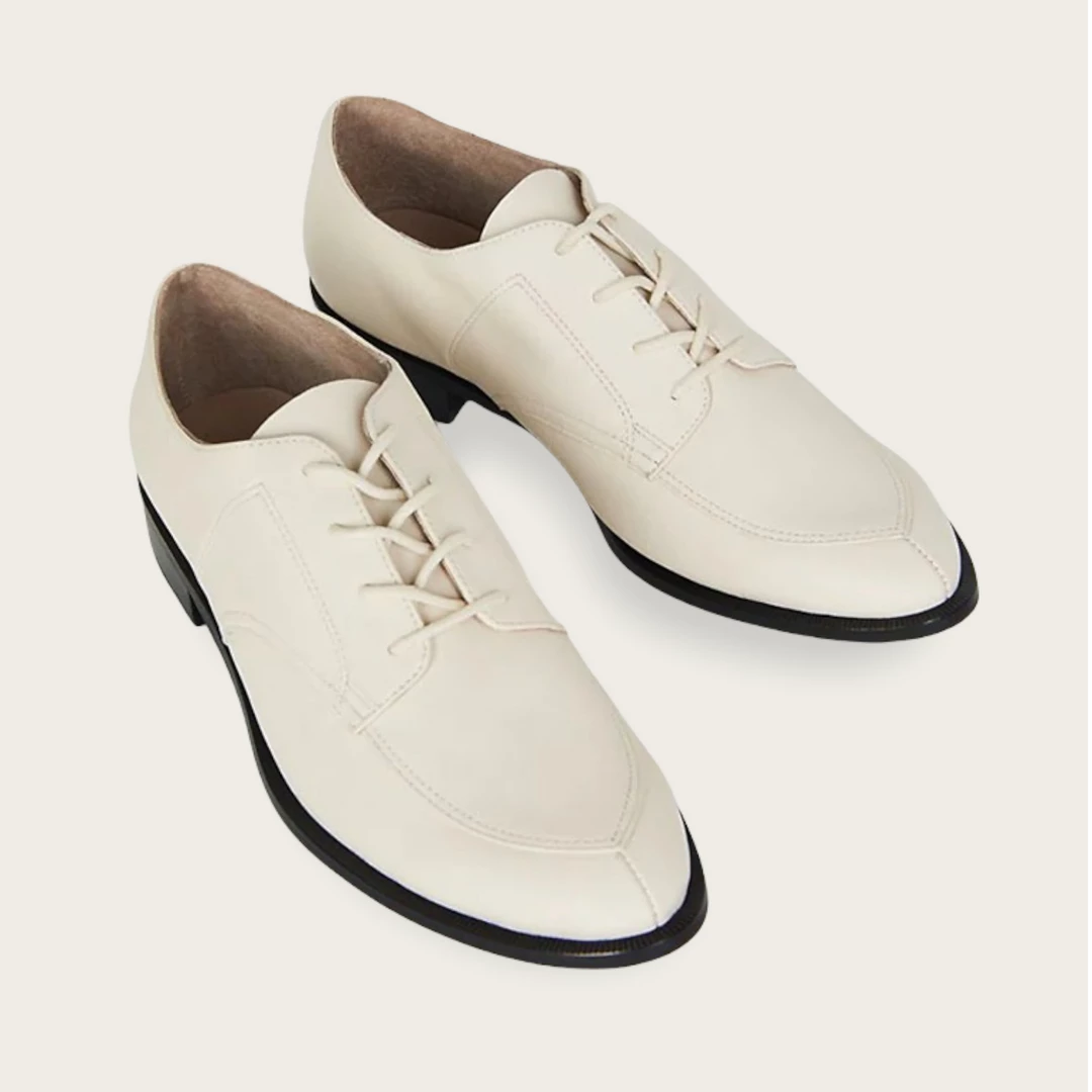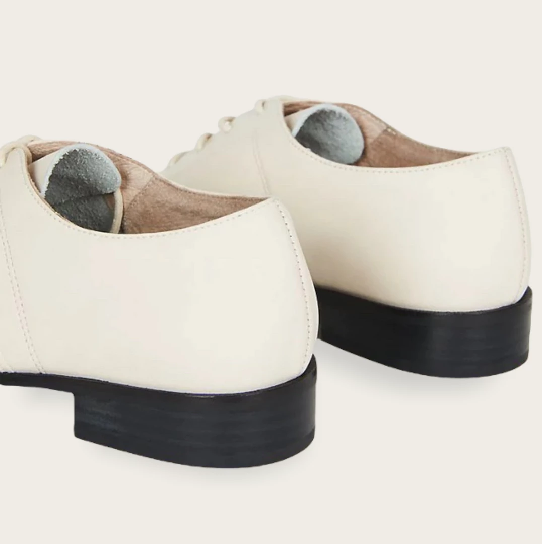 A tailored inspired shoe with four eyelet lace-up, top stitched seam detail across toe box and 1″ heel.