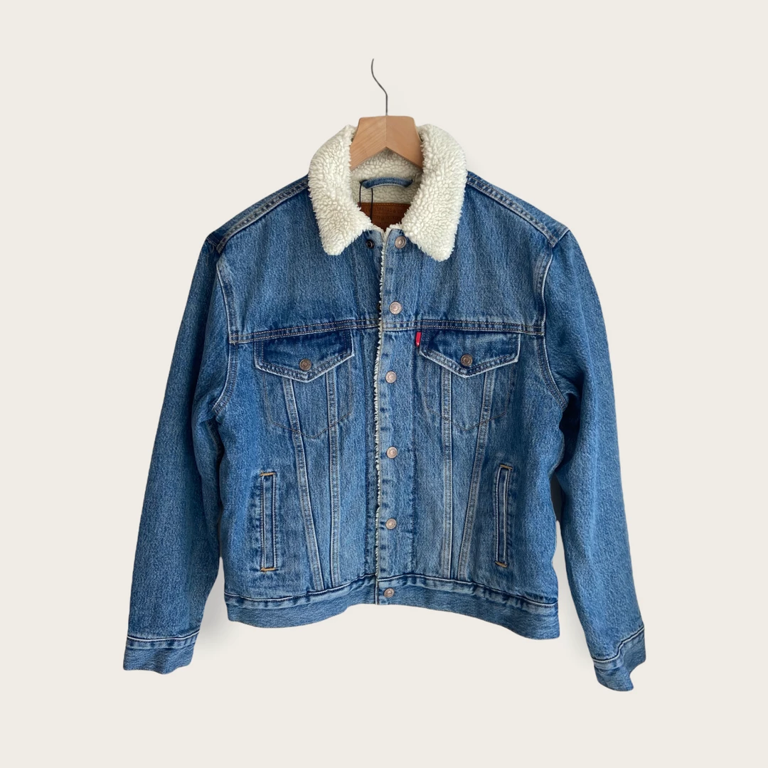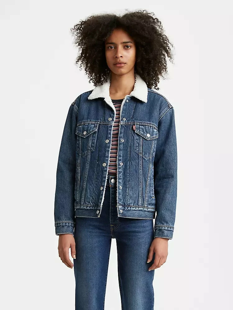 In 1967, Levi’s coined the term “trucker” for their oversized, extra-relaxed denim jacket. Recognizable for diagonal seams that form a narrow, inverted triangle below each breast pocket, this iconic layer – seen here with a shearling-trimmed collar – feels fresh when styled with a swingy skirt and ankle boots.