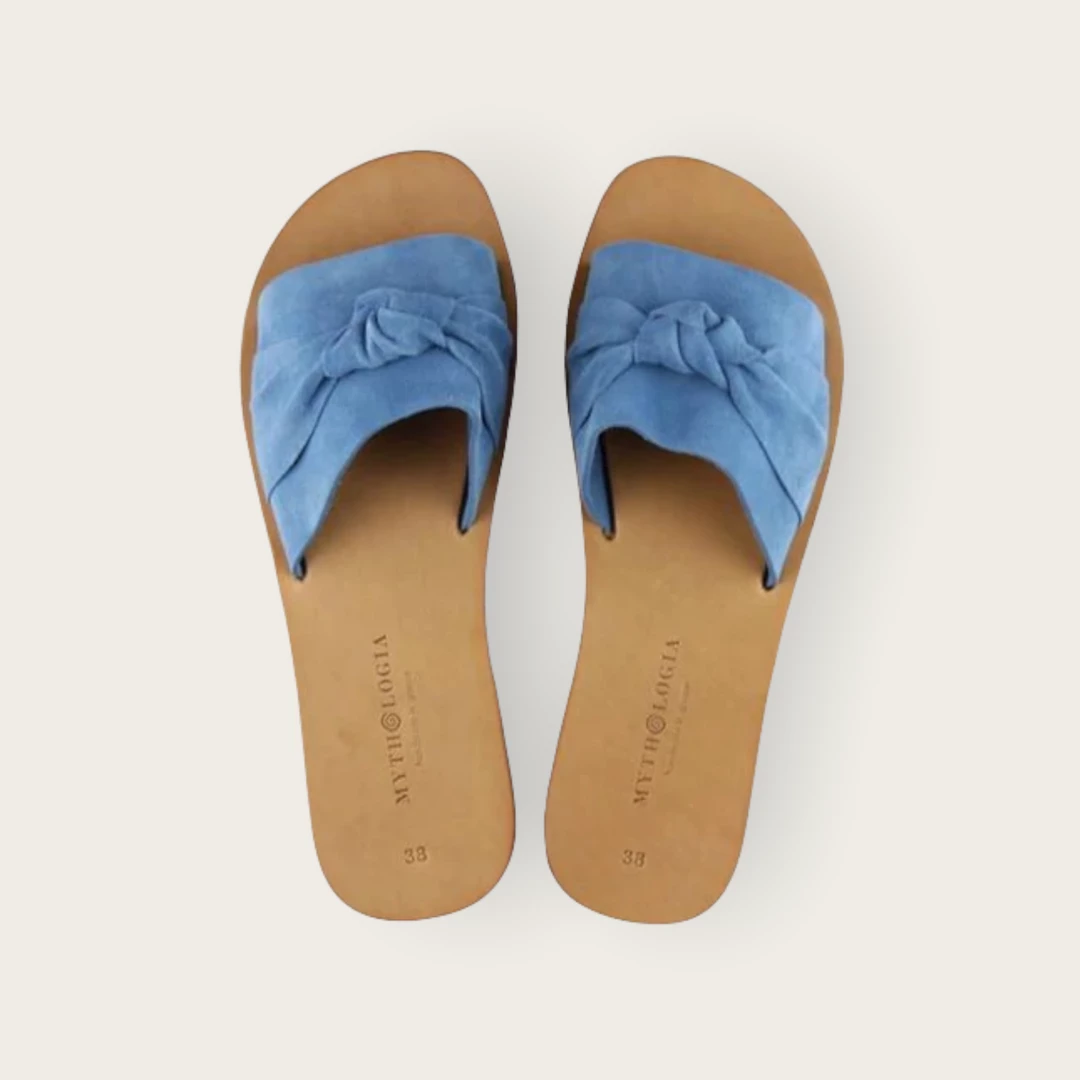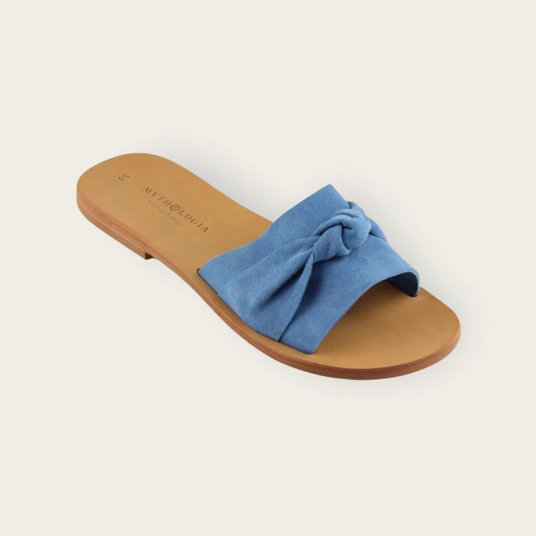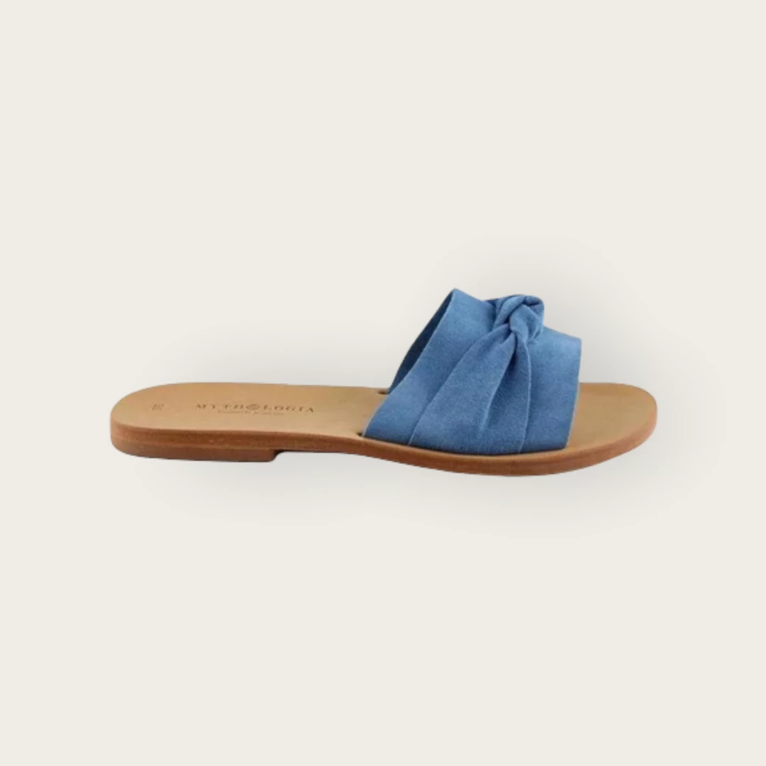 A slip-on slide with a single, soft suede leather strap, and a leather sole.