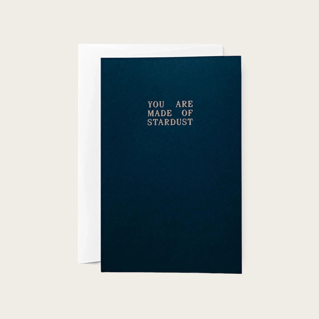 Celestial sentiments. Foil stamped by third generation New England craftsmen on superfine, post-consumer, American paper. Custom card size 4.75” x 7.25”. Signature Noat envelope.