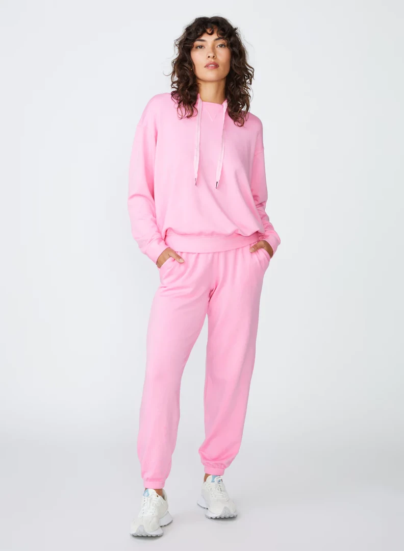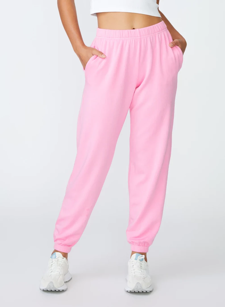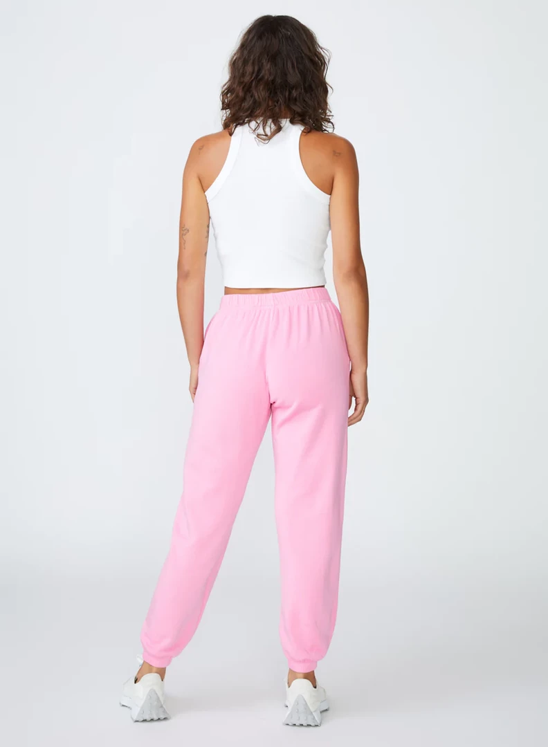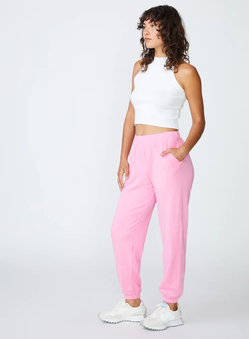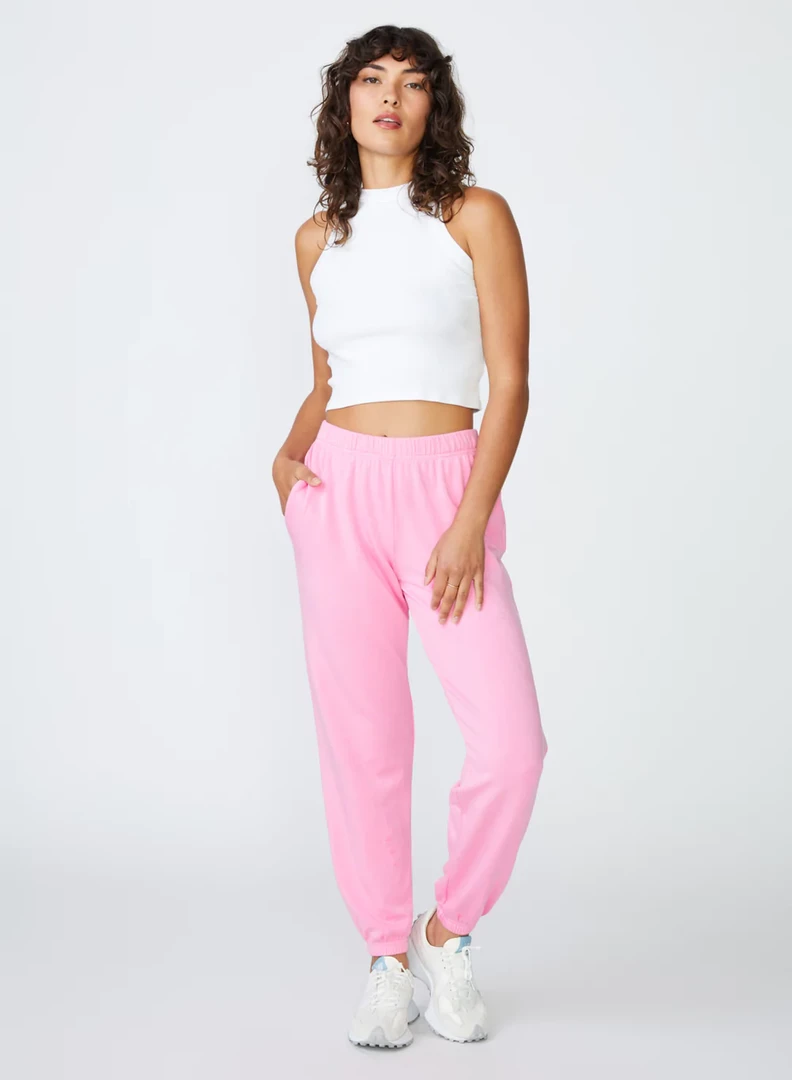 The Softest Fleece Sweatpant in Cotton Candy makes lounging and working out fun with this vibrant pop of color. Whether you’re headed to pilates or relaxing at home, this sweatpant makes every moment just a bit sweeter. The pockets and elastic cuff detailing make this pant everyday ready. Pair it perfectly with one of the racerback tees in Cotton Candy or White by Stateside.Â