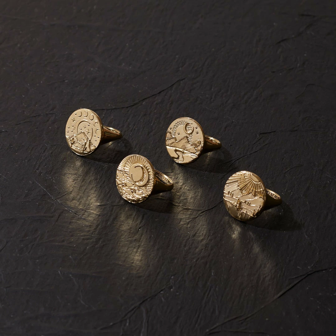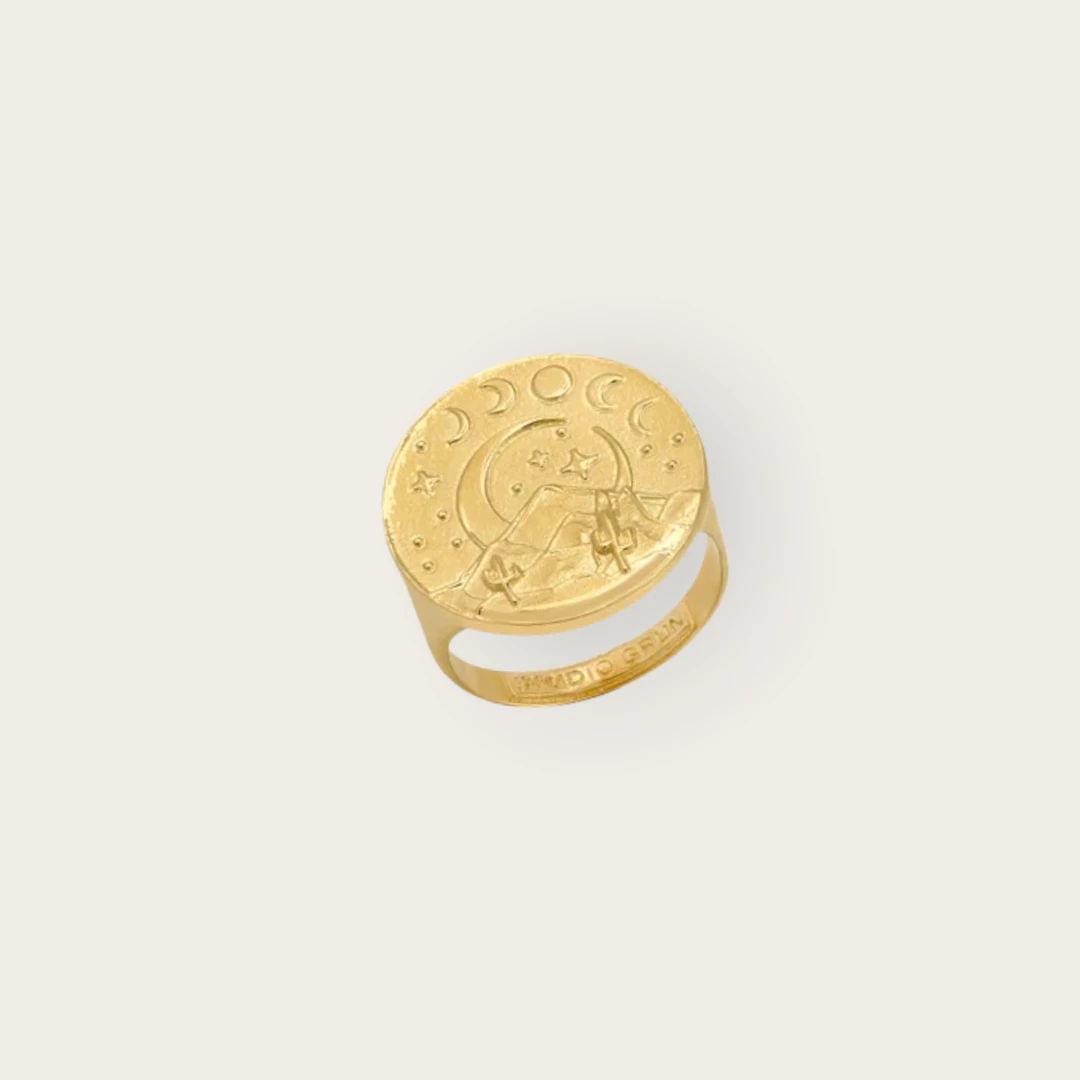 This heirloom signet ring with bold textures and soft facets, features a starry night and cactuses on a rocky hillside.