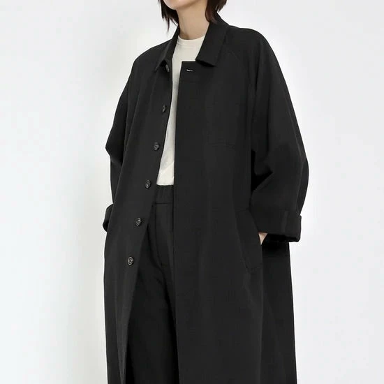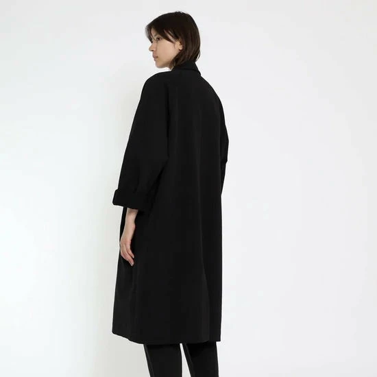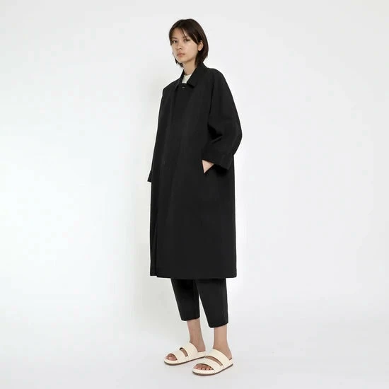 A classic, tailored mid-length duster coat. Crafted in a textured 100% cotton. Boxy fit for comfortable layering. Features pointed collar, straight hem, concealed placket, raglan sleeves and two front side pockets for your essentials.Â