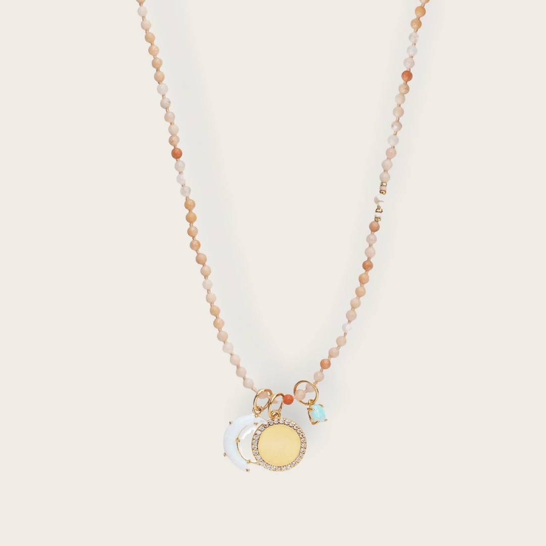 The Pink Aventurine Knotted Necklace with Opal details by Tai Rittichai is a stunning necklace you’ll find yourself living in. Pair with our peach Neem Kaftan or the Stateside tee and a pair of Boyish jeans.