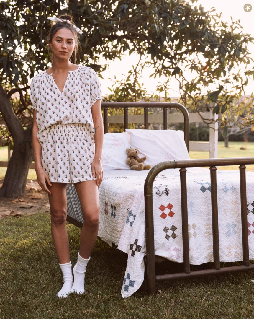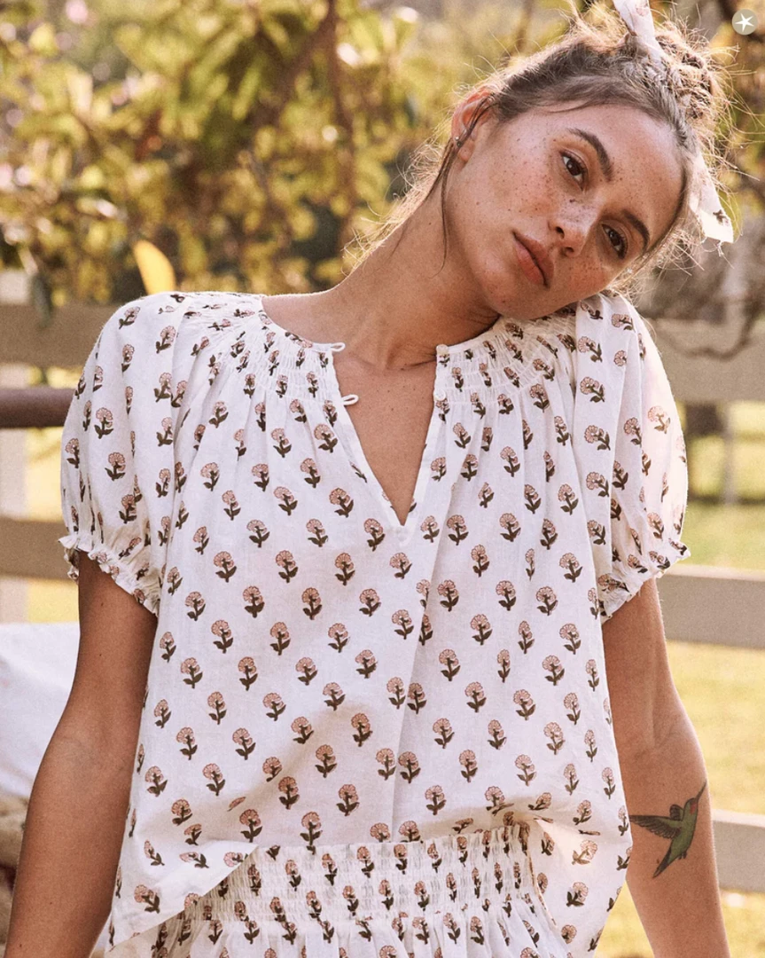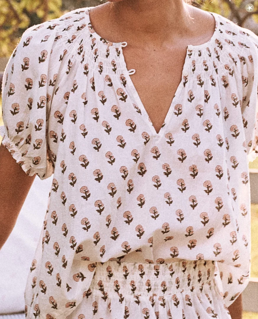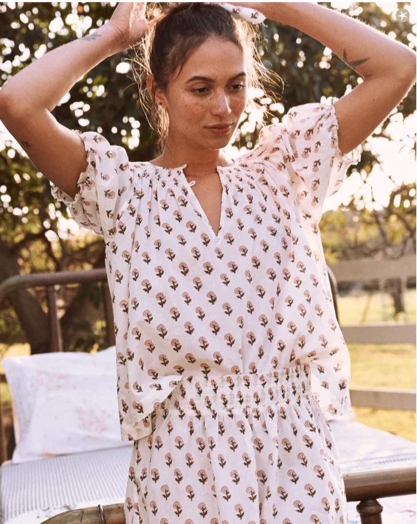 The Smocked Sleep Top. is made for warm-weather lounging in a beautiful woven block print, applied by hand. This Victorian-inspired blouse has a relaxed fit and features a low scoop neck and feminine puff sleeves. Pair this throw-on style back to The Smocked Sleep Short. for a matching set, or wear it with denim for an easy daytime look.