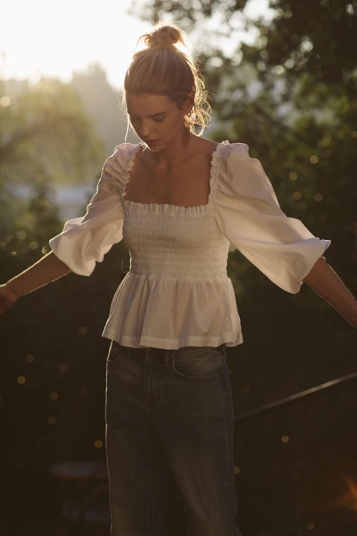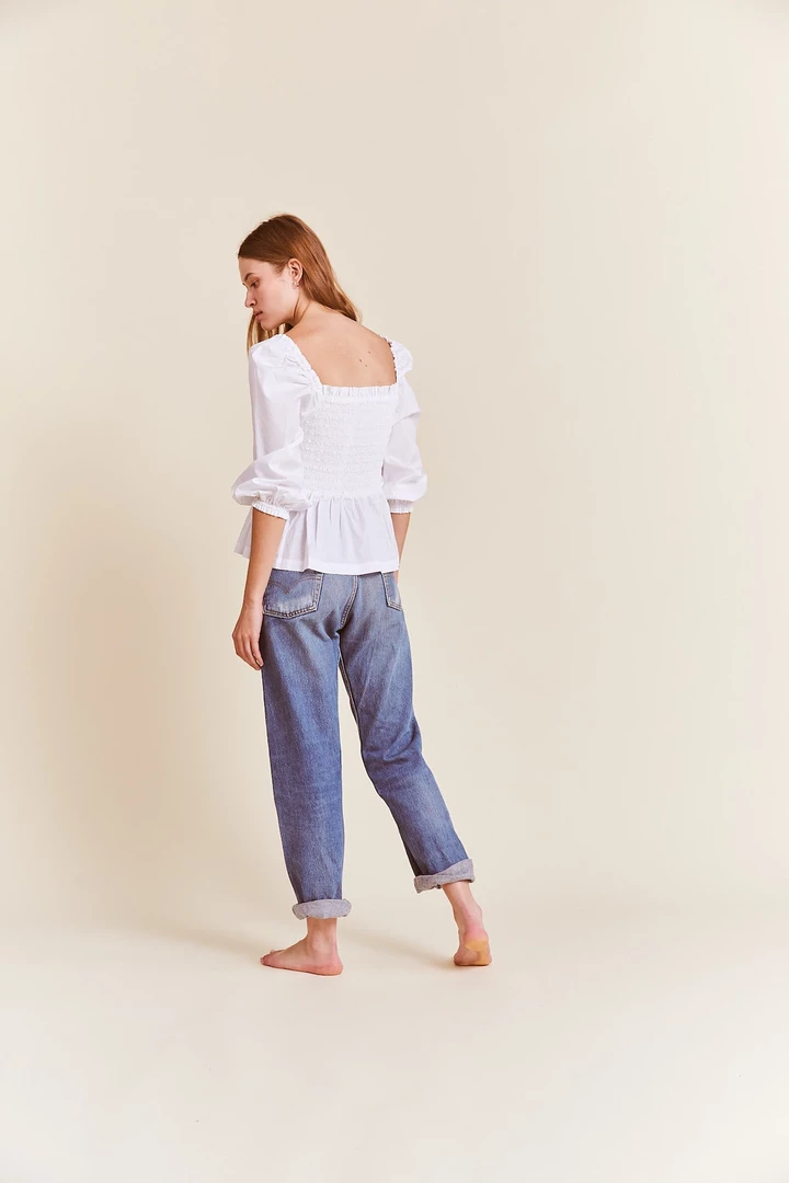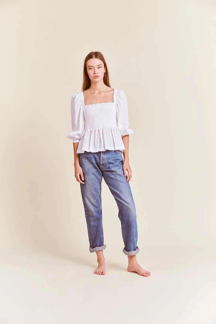 Our Alize blouse is our newest peasant blouse. It has a smocked bodice with puff shoulder and ruffled trim along should and square neckline. Shown here in solid White poplin.