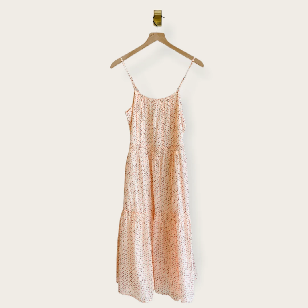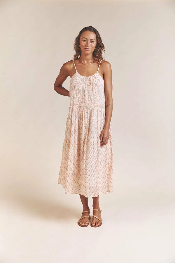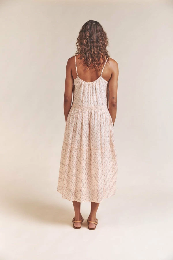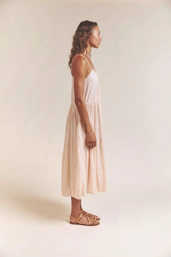 This Julian Strappy Dress by Trovata is a spring and summer staple. “Barely there” straps contrast the dramatic fullness of this lined dress with hidden side seam pockets. The shaped waist drawstring gives way to delicate gathers finished off with a midi-length hem. The adjustable straps have vintage metal rings and adjusters that allow for a custom fit. Shown here in Cerise Ditsy. Made from soft cotton voile.