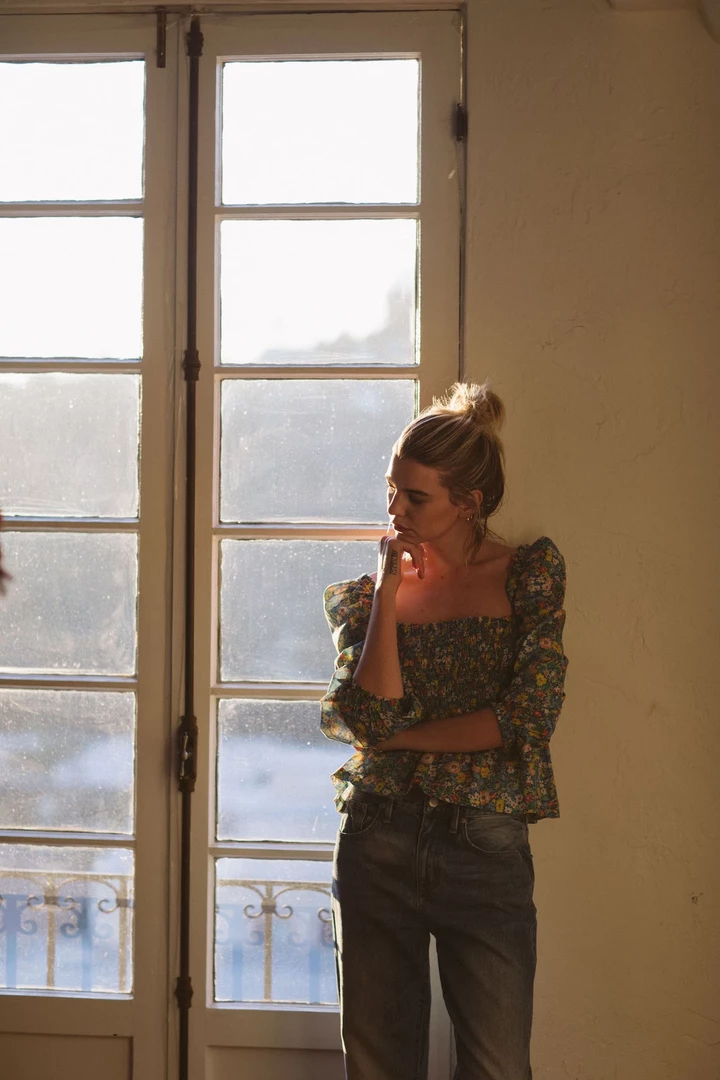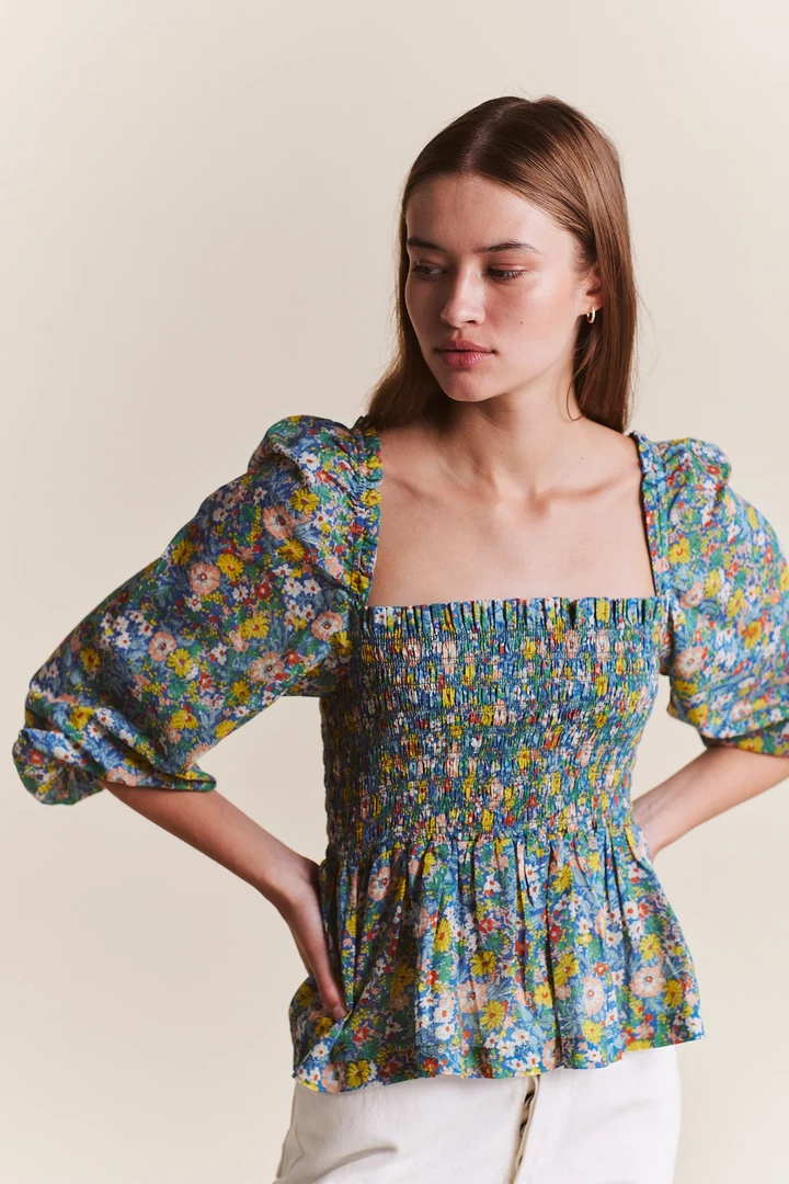 Our Alize blouse is our newest peasant blouse. It has a smocked bodice with puff shoulder and ruffled trim along should and square neckline. Shown here in solid White poplin.