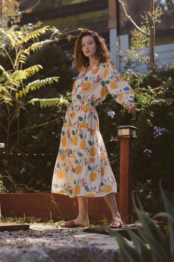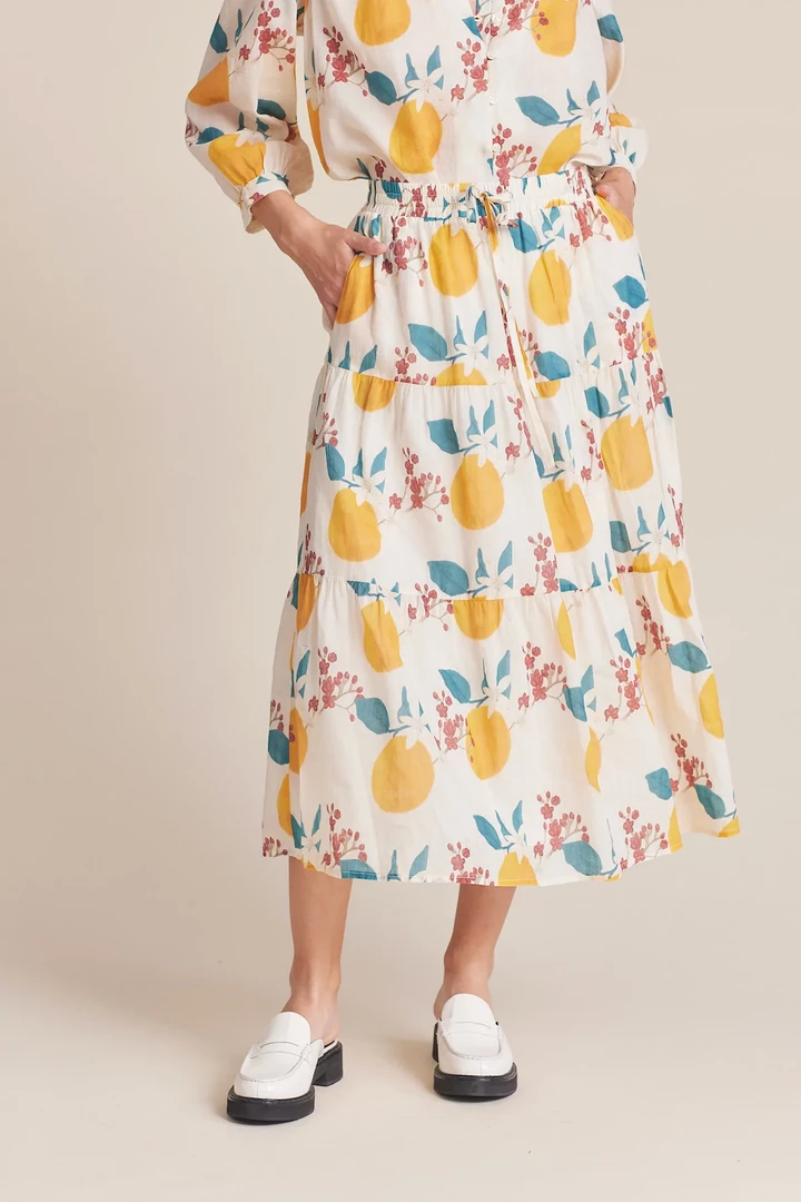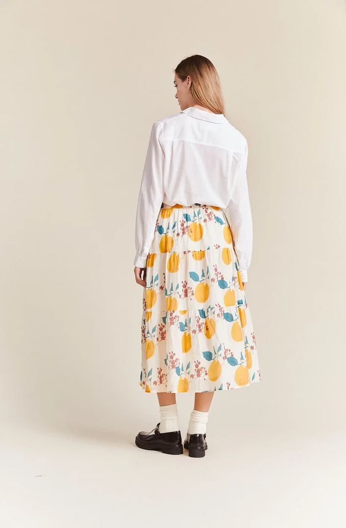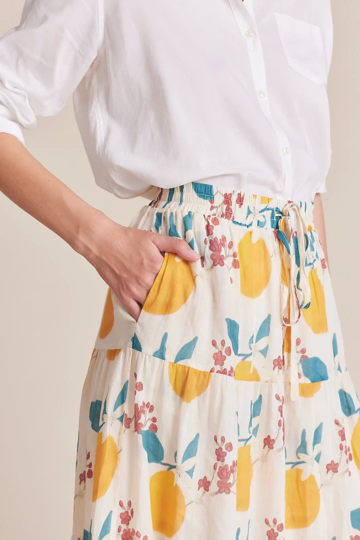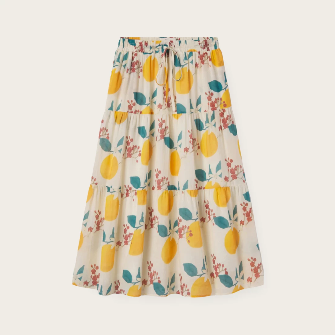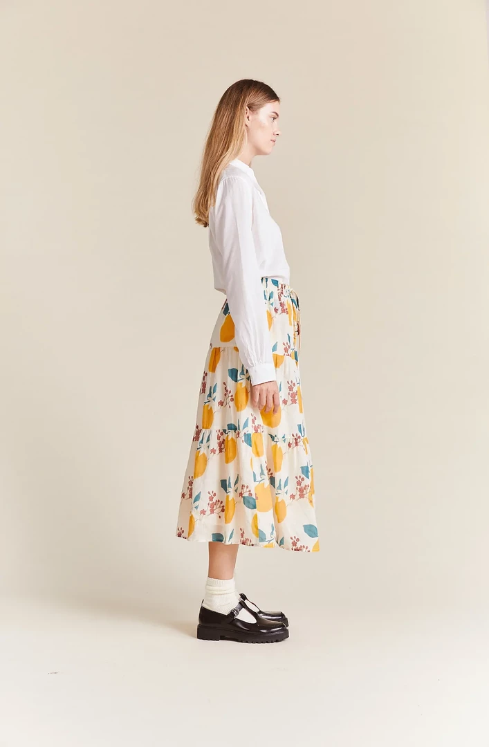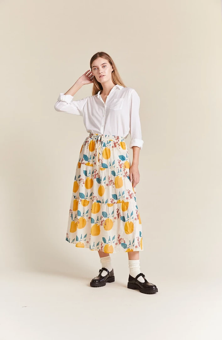 This easy midi-length 3-tiered pull on skirt has a soft elastic waistband with matching fabric drawstring, finished with double tiered ruffled skirt. Shown in Valencia Print. Made from our customer ramie and cotton blend.